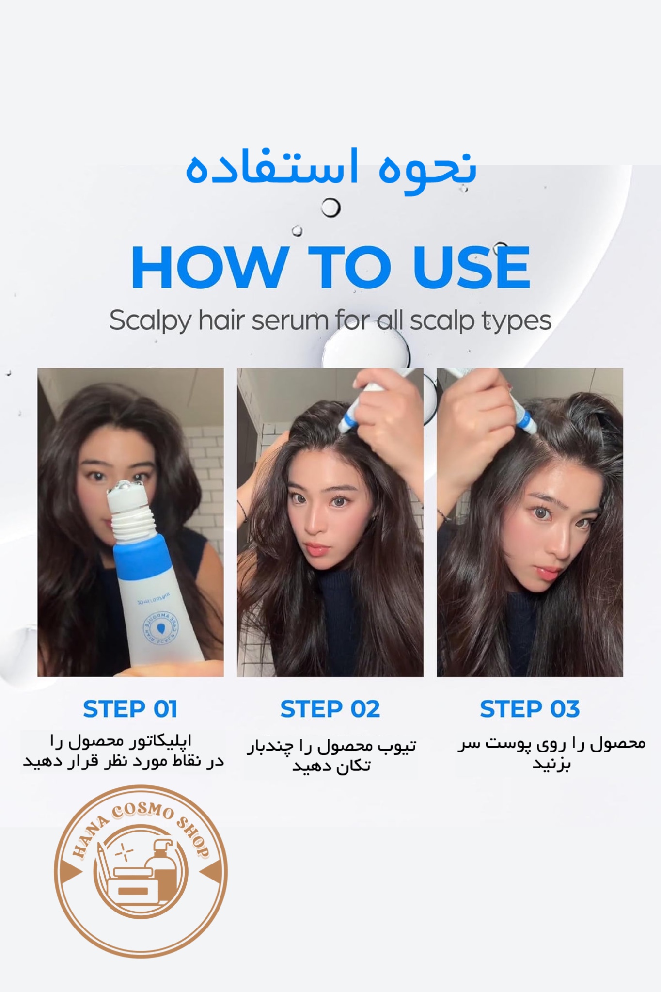 1. اسکالپ (پوست سر) باید تمیز باشد؛ میتوانید پس از حمام یا روی پوست سر خشک استفاده کنید.