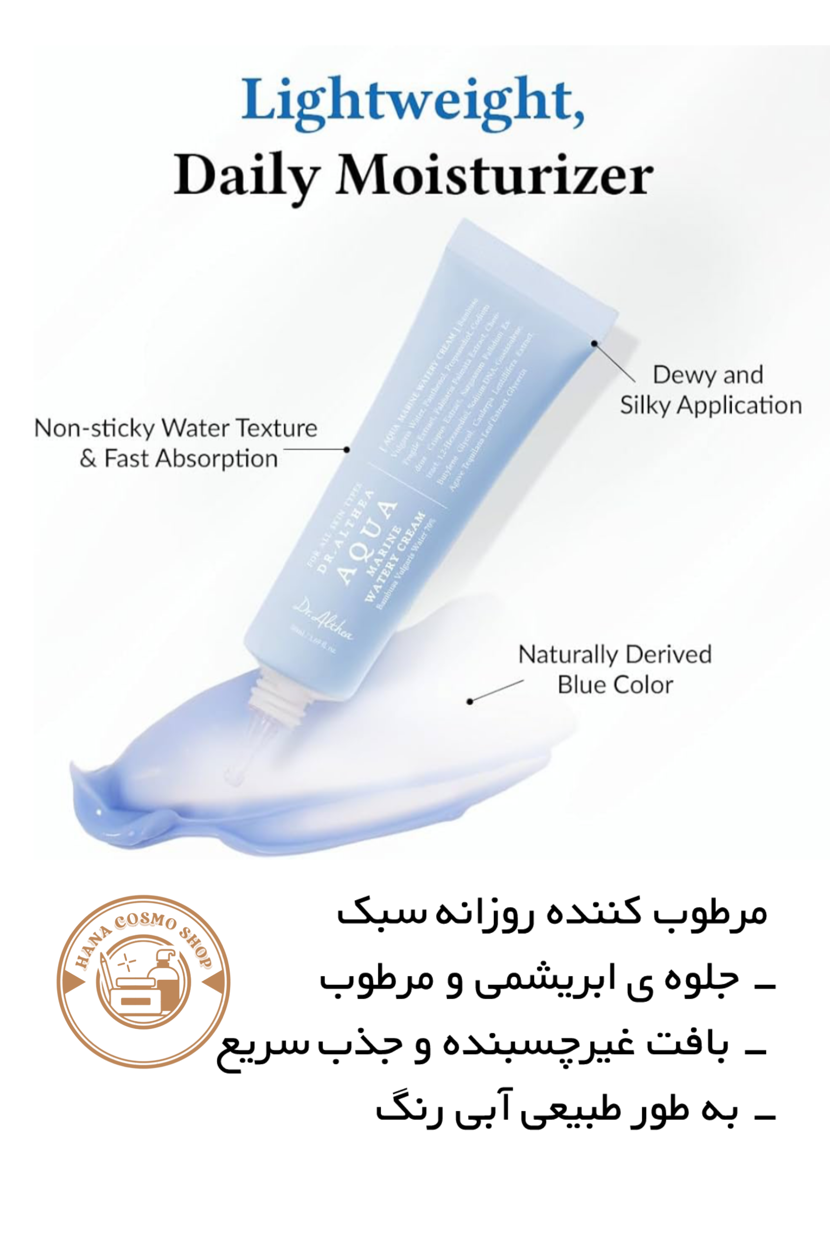 Dr.Althea Aqua Marine Watery Cream یک کرم آبرسان ژل-کرم سبک و واتری است که با فرمولاسیون پیشرفته و مواد فعال دریایی طراحی شده تا رطوبت عمیق، شادابی و طراوت را برای پوست فراهم کند. این محصول با بافتی بدون چربی و جذب سریع، برای استفاده روزانه و مناسب انواع پوست حتی پوستهای حساس ابداع شده است.