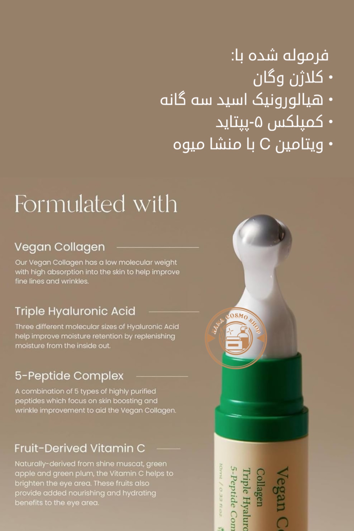 سرم ضد چروک و روشنکننده دور چشم کلاژن و پپتاید اکسیس وای، محصولی تخصصی و پیشرفته برای مراقبت از پوست حساس دور چشم است. این سرم با فرمولاسیون منحصر به فرد خود حاوی ترکیبات فعال کلاژن و پپتایدهای قدرتمند، به کاهش خطوط ظریف و چین و چروکها کمک میکند و در عین حال تیرگی و کدری اطراف چشم را کاهش میدهد. با استفاده مداوم، پوست دور چشم شما روشنتر، سفتتر و جوانتر به نظر میرسد.