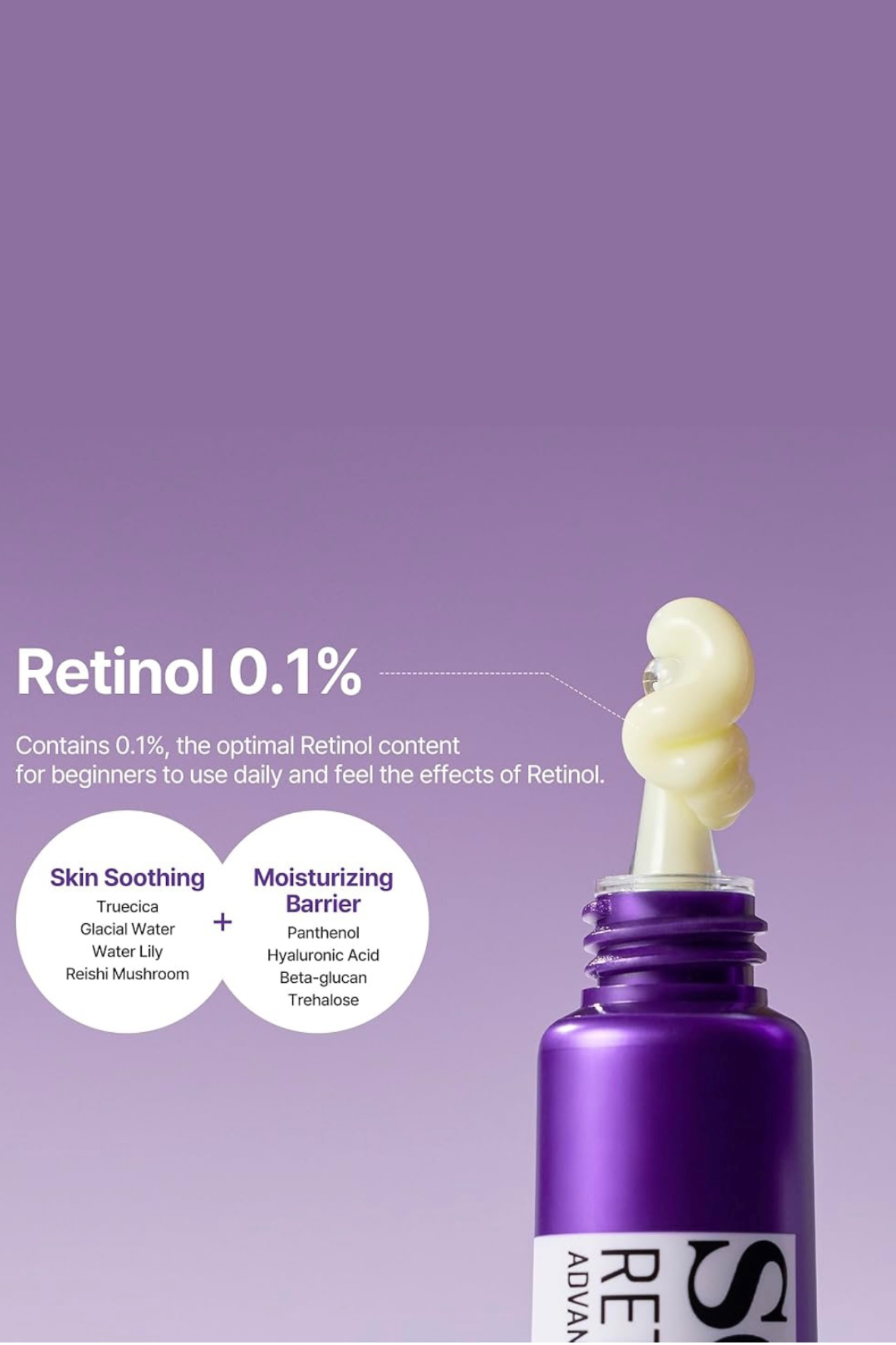 • رتینول (0.1%): فرم فعال و قدرتمند ویتامین A، کمک به تحریک تولید کلاژن و کاهش چروک