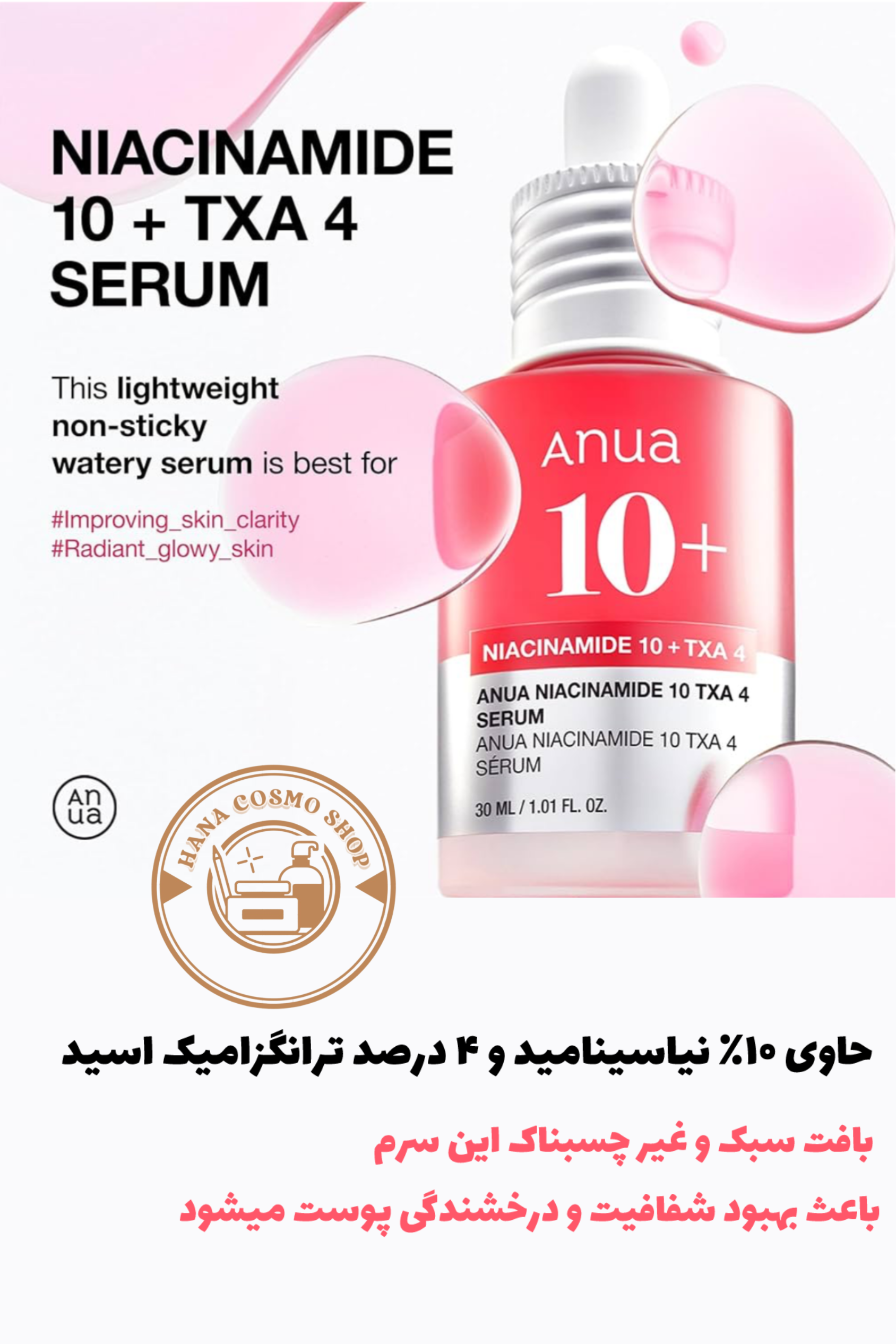 سرم ضد لک نیاسینامید 10% + ترانگزامیک 4% ضد لک و روشن کننده آنوا حجم 30mL